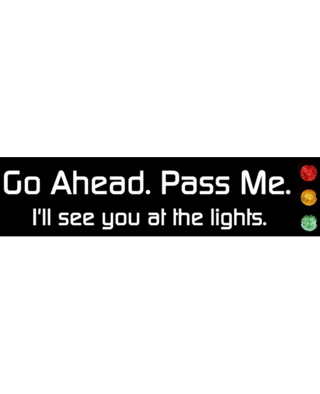 Send a message to speed demons with this "Go Ahead. Pass Me. I'll see you at the lights" bumper sticker. Ready to use as is or change to suit using our custom design software, just click "Customise Now". Use your bumper stickers for corporate or service branding, product labelling or business and service promotions by using them as a give-away.